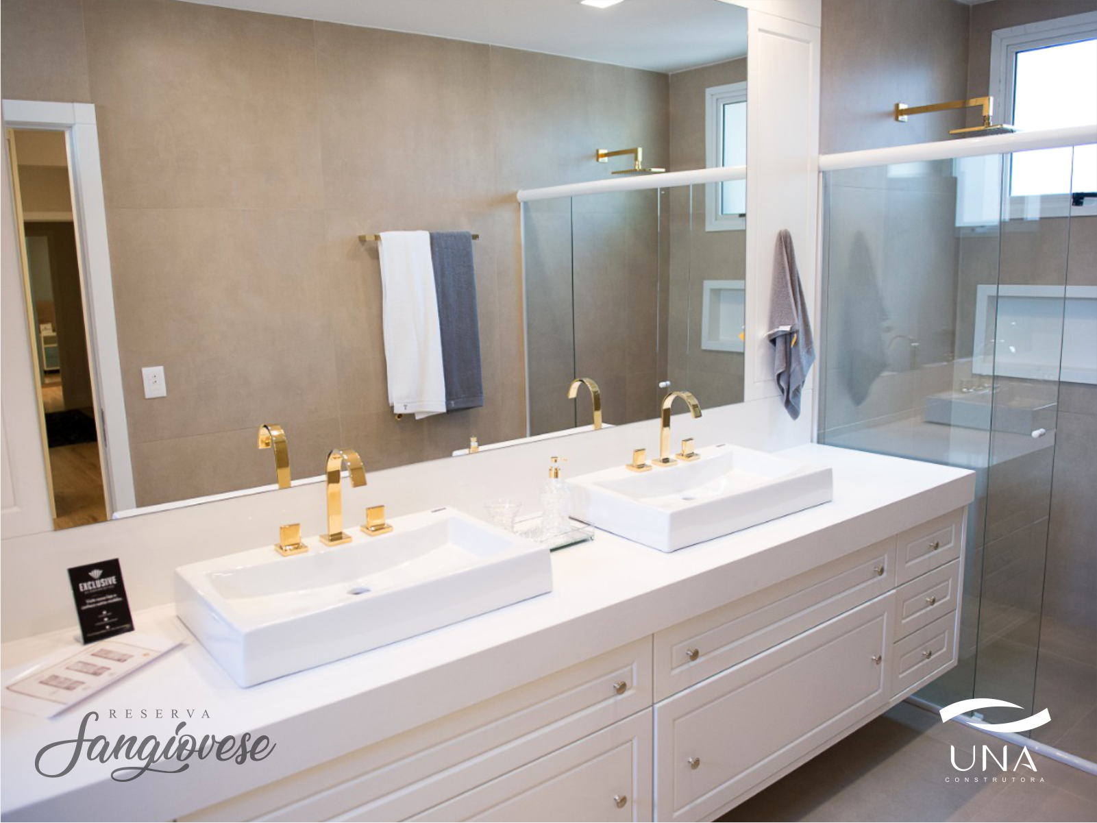 Muito mais que conforto e beleza, a UNA Construtora trabalhou na praticidade e usabilidade desse espaço. Vamos imaginar que o casal sempre sai para trabalhar no mesmo horário, e claro, o banheiro acaba sendo um ambiente disputado. Na suíte master do Reserva Sangiovese, dois chuveiros e duas cubas na bancada garantem maior individualidade ao casal, permitindo que as duas pessoas utilizem o banheiro ao mesmo tempo.