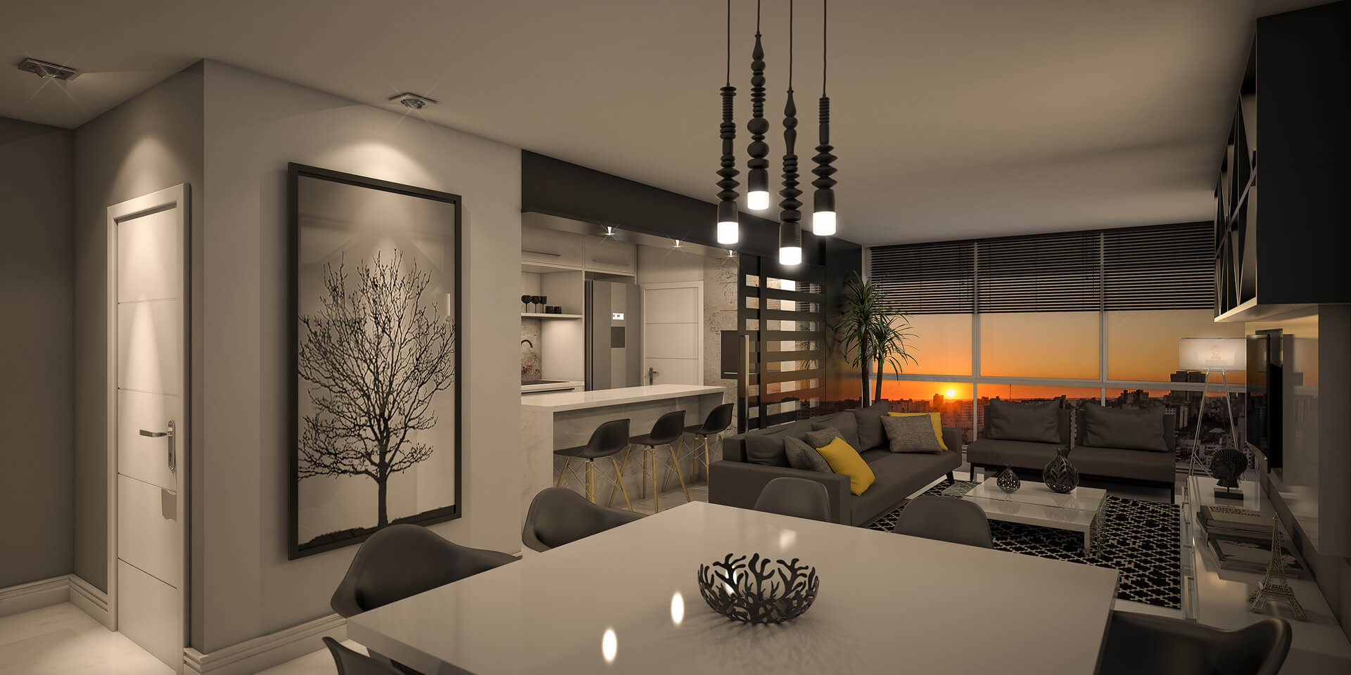 • Living integrado com cozinha e churrasqueira